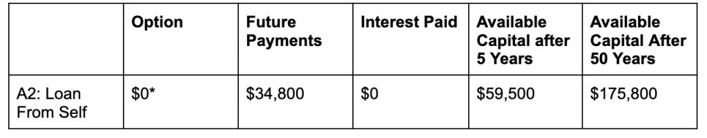 After 5 years, your original $50,000 has grown to $56,400 after taxes, and you have paid $34,800 in principal and interest payments. You paid $4,800 more, but have access to $34,000 more for the next car purchase.